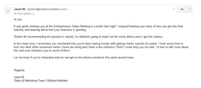 Bawa pulang: Ingat, tujuan promosi jualan adalah untuk membawa prospek ke langkah seterusnya (cth, perbualan lain, janji temu). Janet menyertakan CTA yang jelas pada penghujung padangnya — panggilan telefon. Dia menetapkan masa yang mereka boleh bertemu dan meletakkan bola di gelanggang Jim.
